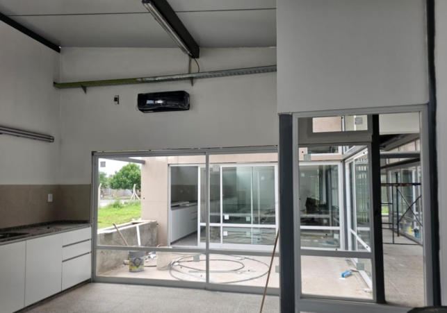 En el interior del establecimiento, la instalación de muebles de cocina y mesadas está prácticamente finalizada. Tanto las paredes como los cielorrasos ya están terminados y pintados. Las instalaciones eléctricas están ejecutadas y las luminarias LED colocadas. También se montaron los equipos de aire acondicionado y las carpinterías interiores de aluminio y vidrio, incluyendo puertas corredizas y ventanas hacia el patio interno.