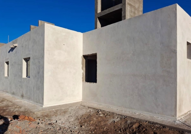 En Zanjitas, la Provincia tiene en ejecución seis hogares que ya presentan un importante grado de desarrollo, con la estructura principal de hormigón completamente ejecutada y los volúmenes de cada unidad claramente definidos. Actualmente, se trabaja en el revoque grueso en la base de tanques, se finalizaron las babetas de hormigón en cubierta y se realiza el pintado con emulsión asfáltica en techos, mientras que en el interior se inició el canaleteado para la instalación eléctrica. La obra dejó atrás las etapas iniciales y se encamina hacia las próximas fases de instalaciones y terminaciones.