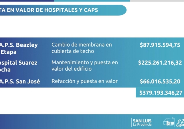 También comenzará la refacción integral del Hospital ‘Dr. Suárez Rocha’, en Villa Mercedes. Allí se realizará una puesta en valor completa que abarcará la impermeabilización total de techos, reparación integral de revoques, renovación de instalaciones sanitarias y eléctricas, cambio de luminarias, recambio de aberturas y pintura general en distintos sectores del edificio. Para esta obra se destinarán $225.261.216,32, con un plazo de ejecución de 120 días corridos.