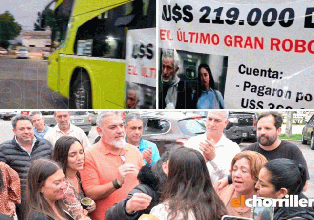 “US$ 219 mil dólares. El último gran robo 9/12/23”, consigna el cartel colgado en el colectivo que mostró esta mañana el periodista Emanuel Moreno en un informe para El Puntano.